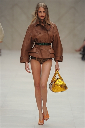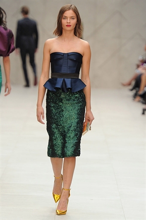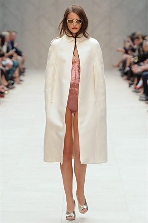 Christopher Bailey told The Telegraph that the collection this season was “a little bit sassier, a little bit sexier, and a little bit more joyful” and this is exactly what we got – futuristic fabrics, including transparent rigid vinyl for cropped capes and handbags, colour clashing mixing bold hues of deep purples, bright reds, lime and emerald greens, turquoise blues, not to mention the statement pointed wedge shoes that completed each outfit in the most alluring manner. There were new shapes as well, like the utterly sexy satin basques or the capsule-like oversized capes in ecru or navy blue. However, knee-length pencil skirts and peplum bustiers, as well as trench and cropped jackets, dominated the show. The Burberry woman knows how to have fun and give a modern twist to her silhouette but she remains above all extremely elegant in garments with clean, neat cuts.