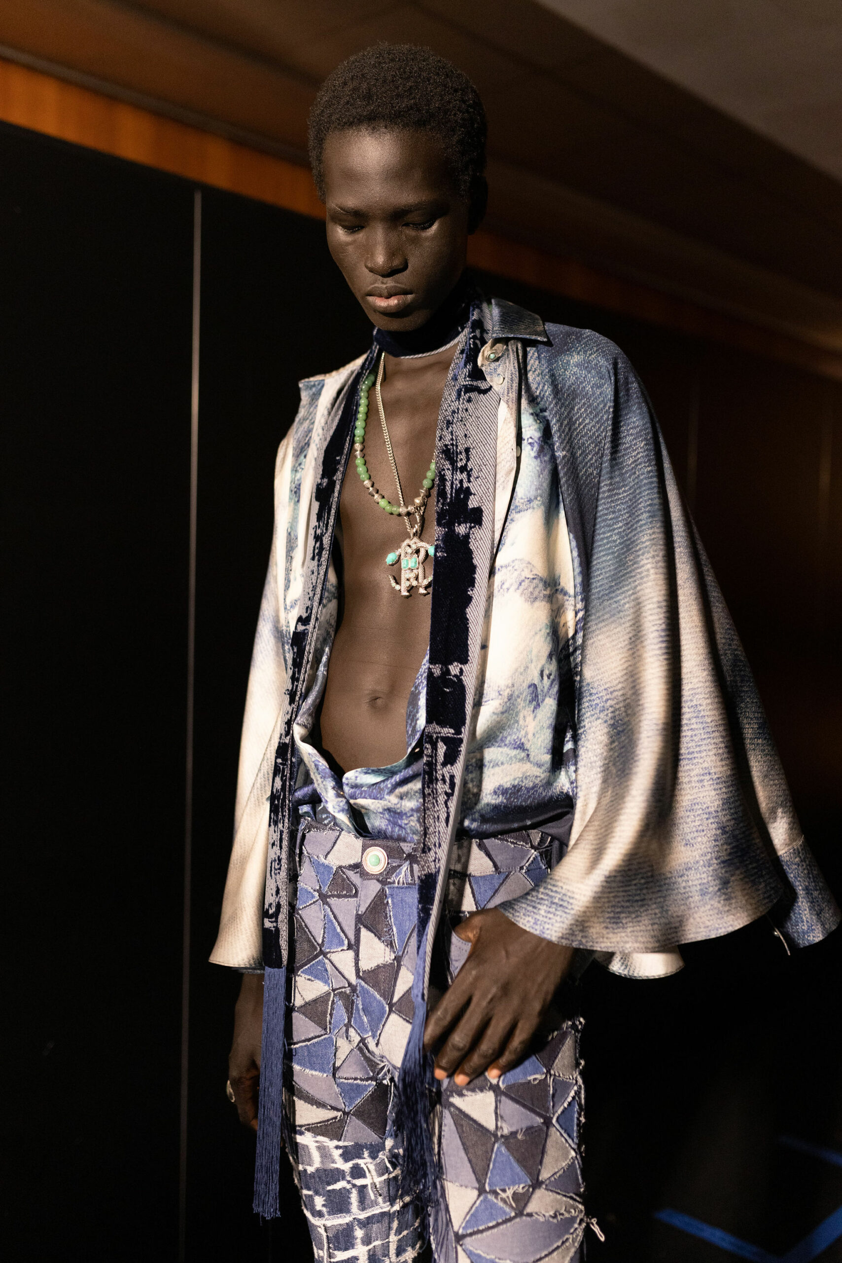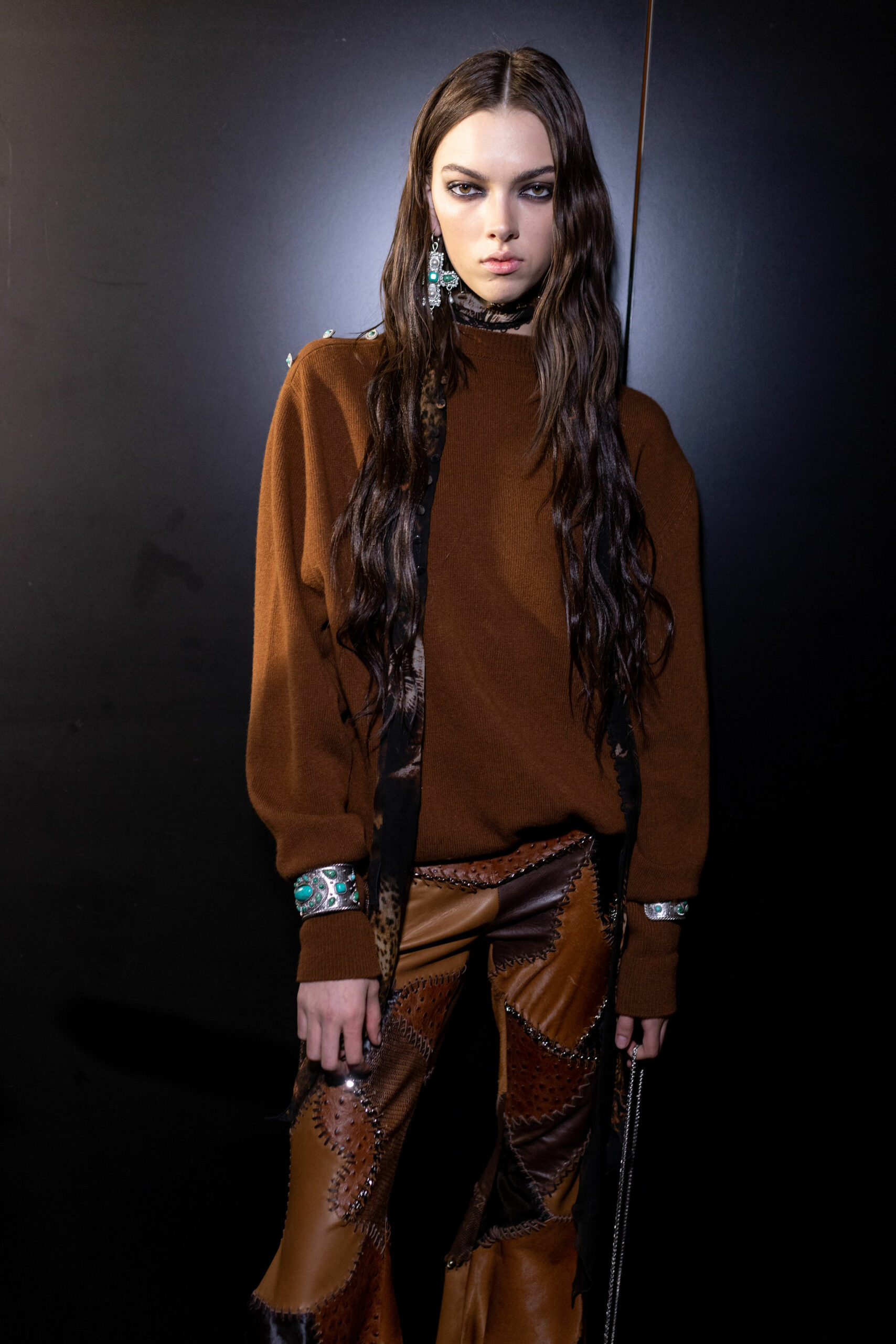 Don’t ask Fausto Puglisi to explain the fierce conjunctions that happen in his head as he gets down to work at Roberto Cavalli. Even at their more outlandish, even at the furthest stretch, they always make sense. That’s the magic of the Roberto Cavalli world, the place Fausto inhabits: a boundless land ruled by unbridled invention. This season Fausto brings the Cavalli woman on a very Cavalli trip to the American Southwest, keeping her trademark liberated spirit, her sensual way of luxuriating in decoration, while following Millicent Rogers and Georgia O’Keefe as muses du moment, and beyond. What an unlikely couple: one exuberant to the point of eccentricity, the other severe and spare in her habit. That’s the kind of friction Fausto loves. These women of widely different personalities, however, have more similarities one would expect: they both ended up in ranches in New Mexico, and they both used dress as a continuation and integral part or their way of being and expressing themselves. The Cavalli woman does the same. Brought in contact with the glaring sun and the elemental life in the West, she gets possibly wilder. She uses turquoise stones aplenty, even just as a button on the blazers, and favors faux fur as her cover up. The thing looks more furry than real fur but is completely man-made. She’s wild, not cruel. The warm and earthy palette of rust, browns, denim blues and blacks accented with a note of pink sets the tone, the focus being on an elongated silhouette that skims the body and dances around it to open at the bottom, and textures that bring the Cavalli focus on materiality to wild new heights. Prints, devorè, patchwork are mixed in ways that bring surfaces alive and make them dance; denim is both real, made in devorè, or photo printed onto silk. Animalier motifs become psychedelic detours around weaves and craft. Shirts flow, trousers flare, tailoring is tall and lean, with bell bottom trouser. Kimonos and liquid dresses have the quintessential Cavalli flow that spills in menswear. Jean jackets are blown up, while lace is cut into figure hugging dresses and tops. It’s the idea of offering separates that women and men can pick up and mix however they prefer. Somewhere, deep down, there is a bourgeois spirit, but that’s been sanded and blasted. In the end, it’s all about dresses as possibilities. Wild or tamed, individual interpretation is what matters.